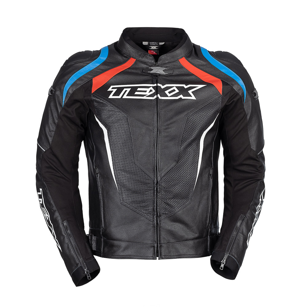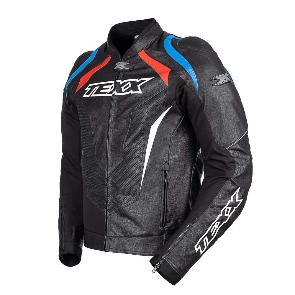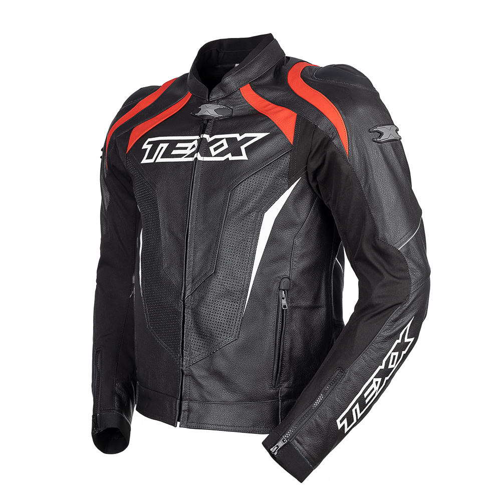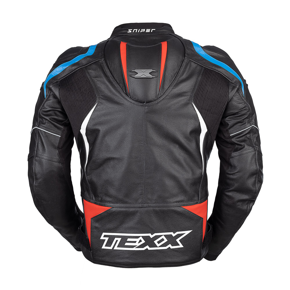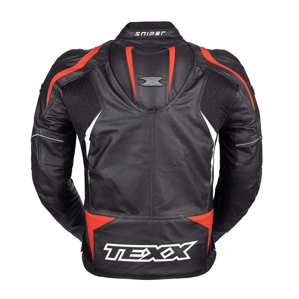 A jaqueta esportiva TEXX Sniper é feita em couro e oferece muita segurança aos motociclistas. Além de protetores EVOLUTION CE nos ombros e cotovelos, ela apresenta o cupim com design inovador, que contribui também para a aerodinâmica.